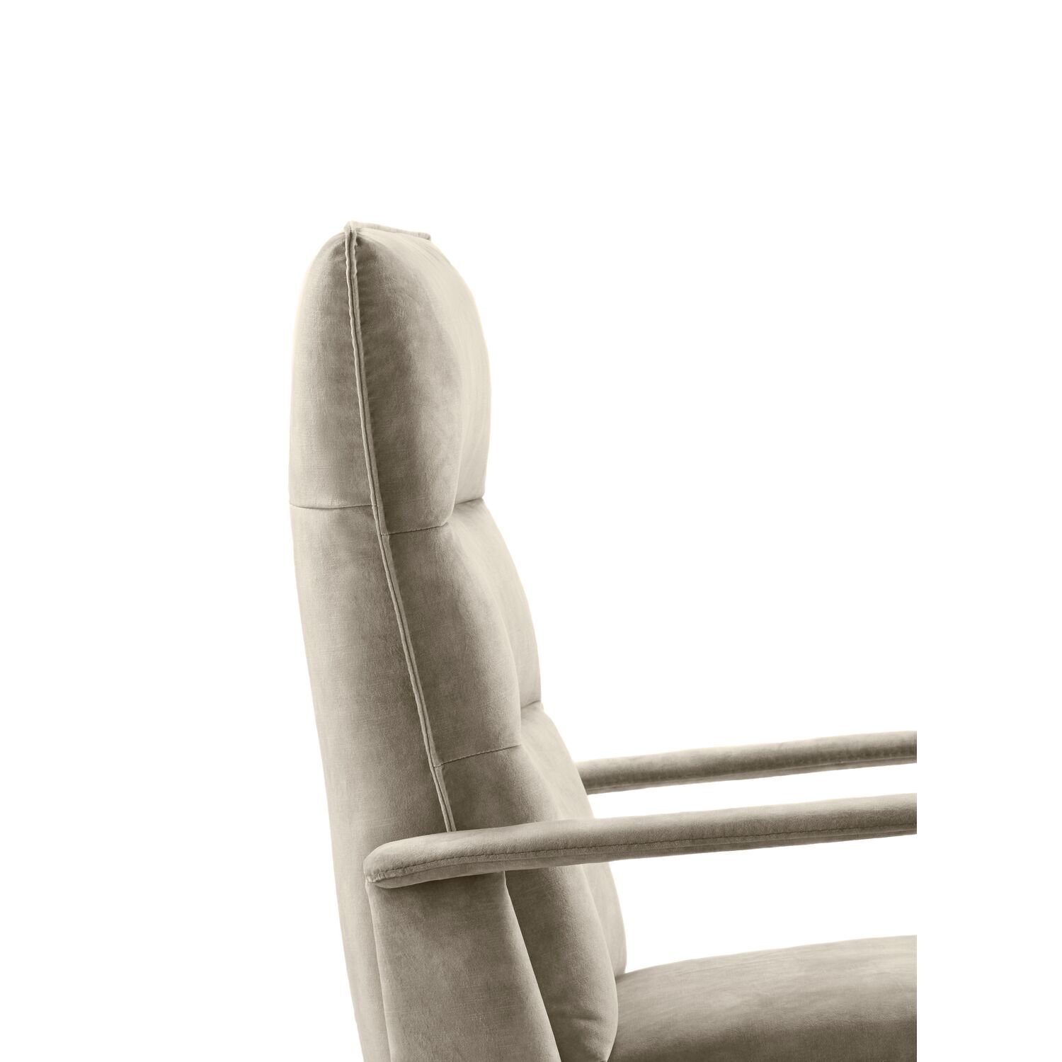 De relaxzetel Seduto heeft een moderne en stijlvolle uitstraling. Deze uitvoering is bekleed met een grijsbruine veloursstof die zacht en comfortabel aanvoelt. Daarnaast heeft deze stof een zeer luxe en warme uitstraling. De horizontale banen in de rug voegen een subtiel elegant detail toe, terwijl de volledig gestoffeerde armleuningen en zwarte schijfvoet het design eigentijds houden.