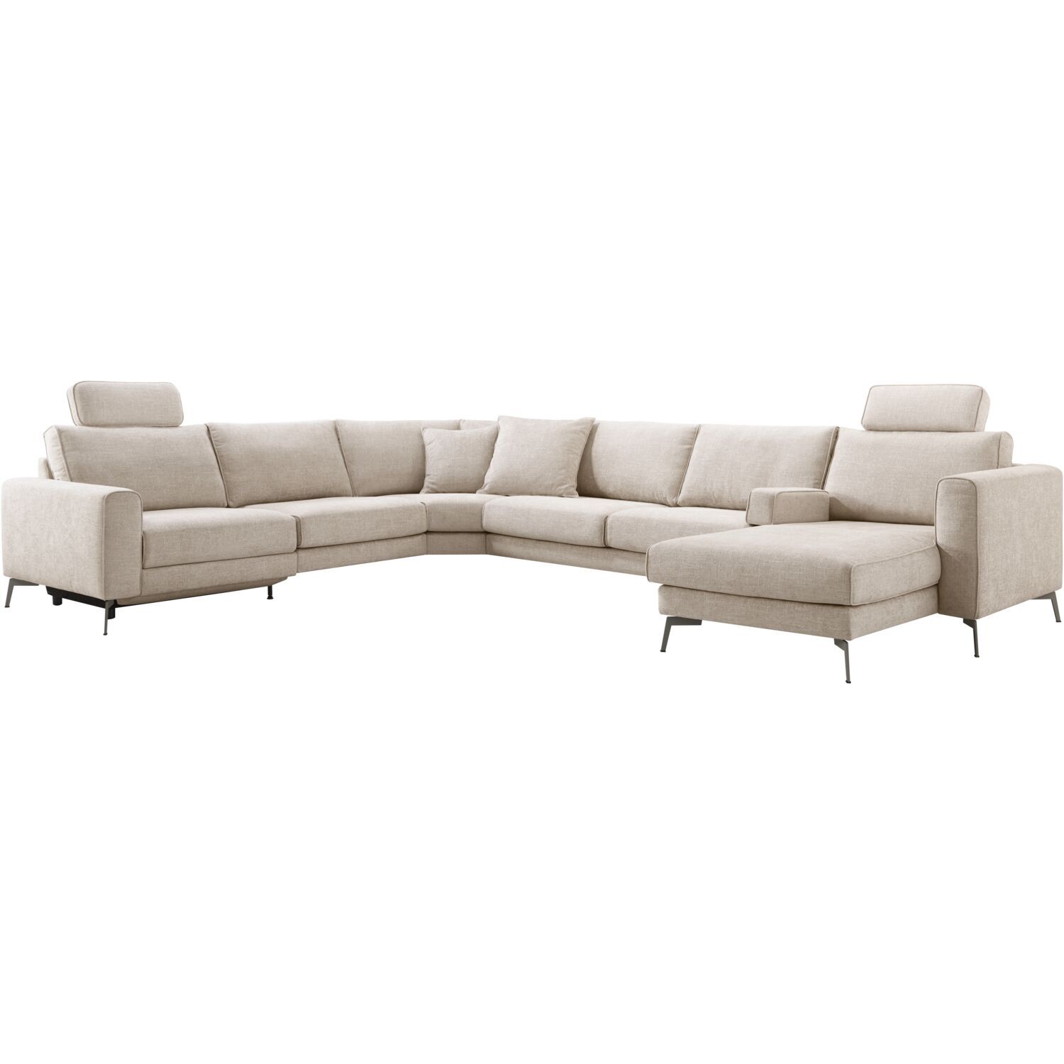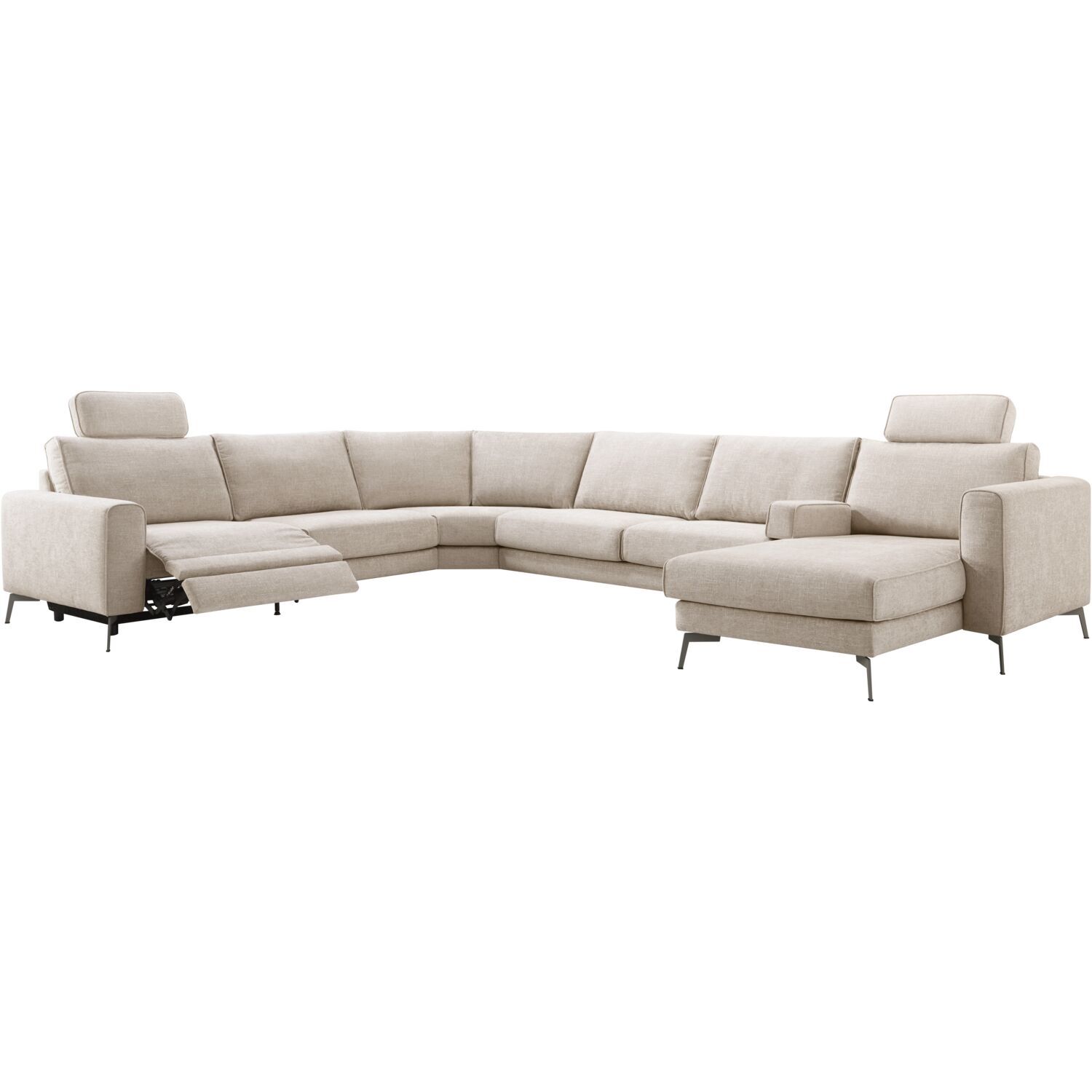 | Uitvoering | 1 zits (80) arm B1 links met 2-motorige relaxfunctie en verstelbare hoofdsteun B 60 met vlindernaad + 1 zits (80) zonder armen + trapezehoek + 2 zits zonder armen + chaise longue arm B2 rechts, uitgevoerd in stof miami 01-natural met 2 lagen HR-koudschuim in de zitting, siliconenvlokken in de rug en grijze metalen poten, type MF1 (7039 grau, hoogte 15 cm). |