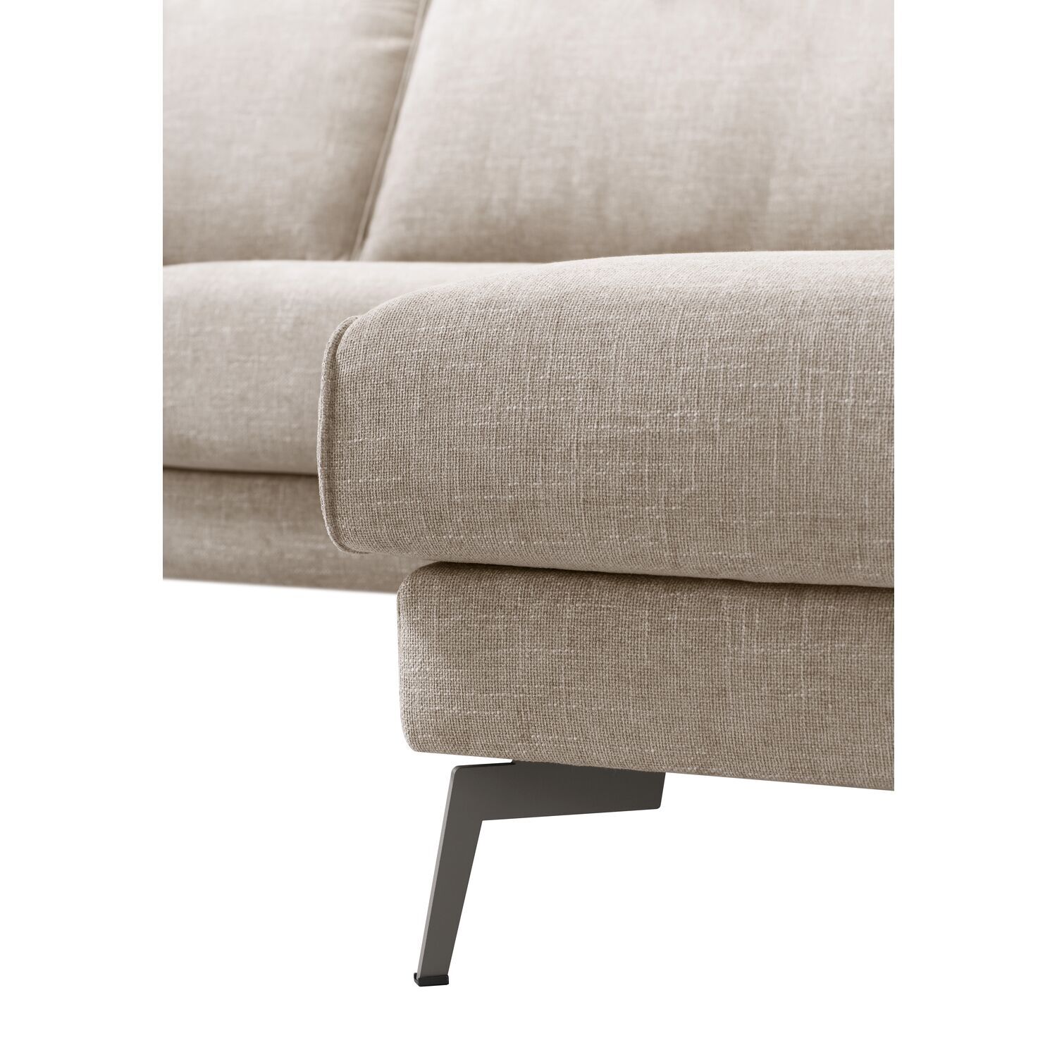 Hoeksalon Linoza heeft een moderne en luxueuze uitstraling dankzij de royale vorm en de karakteristieke vlindernaad. Desalon is uitgevoerd in een beige-grijze weefstof met verschillende kleurnuances en een subtiele glans, wat zorgt voor een warme en levendige uitstraling. De zachte structuur van de stof draagt bij aan het comfortabele karakter van desalon. De donkergrijze metalen poten geven het geheel een eigentijdse en stijlvolle look.