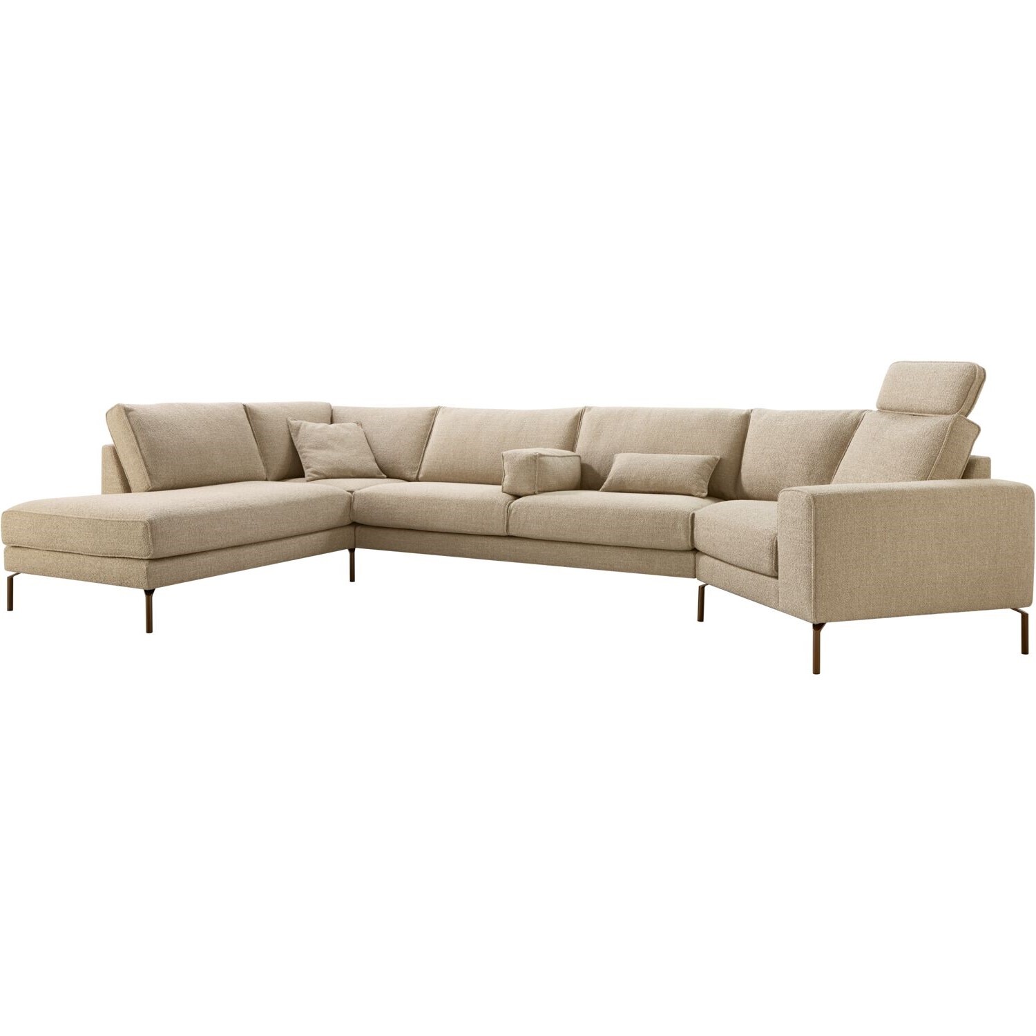 | Uitvoering | Hoek met eiland links + 2,5 zits zonder armen + trapeze element arm rechts (arm A1) uitgevoerd in stof rhythm 10-liver met pocketvering op bonellvering met een toplaag van traagschuim in de zitting, traagschuim met een afdeklaag van donsveren en siliconenvezels in de rug en metalen poten in de kleur perle brown, type MF4 (hoogte 18 cm). |