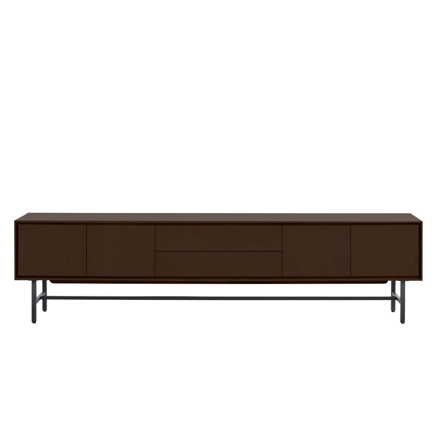 Uitvoering Uitgevoerd in dark oak veneer met een metalen frame met 4 deuren, 1 lade en 1 klep.